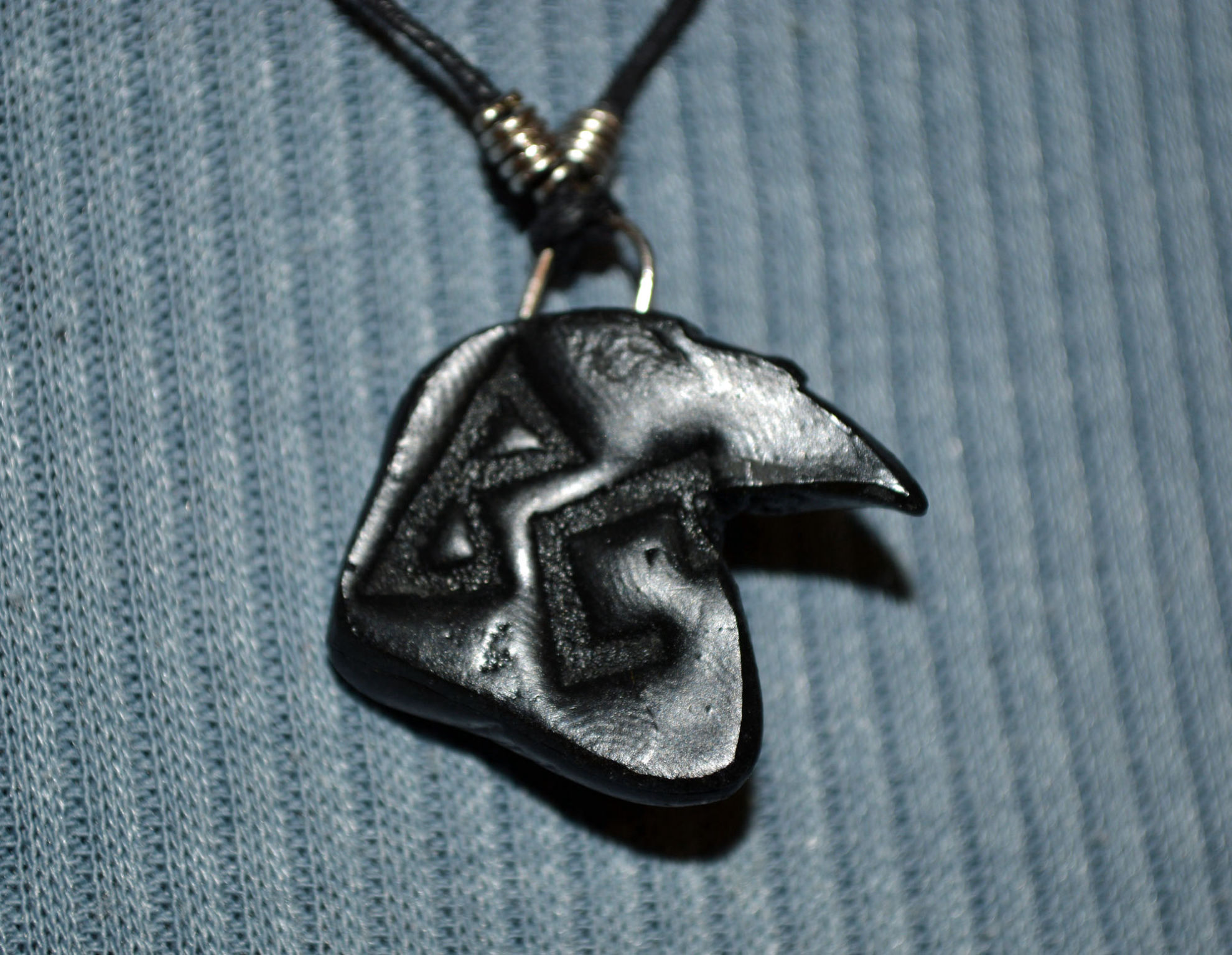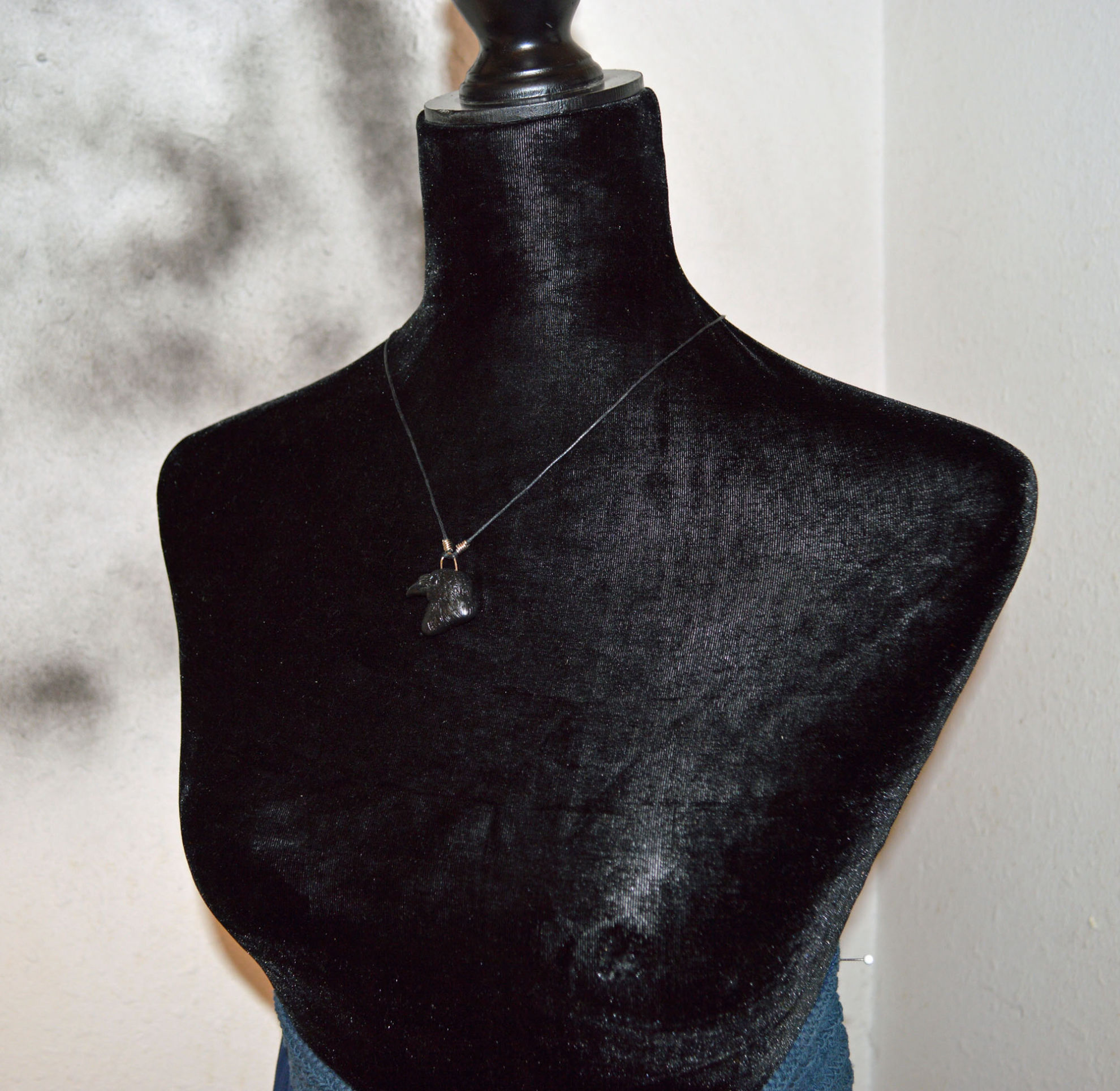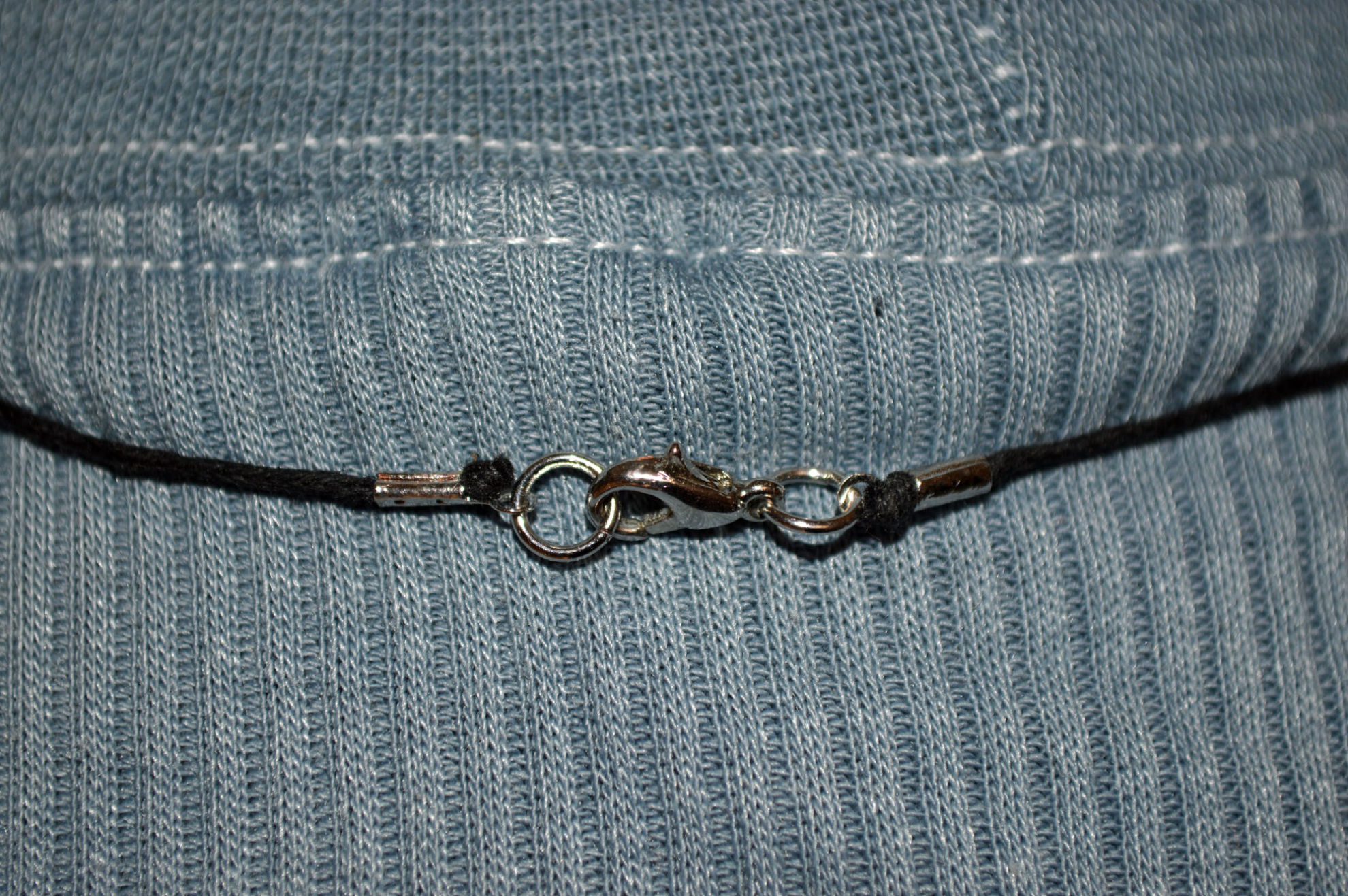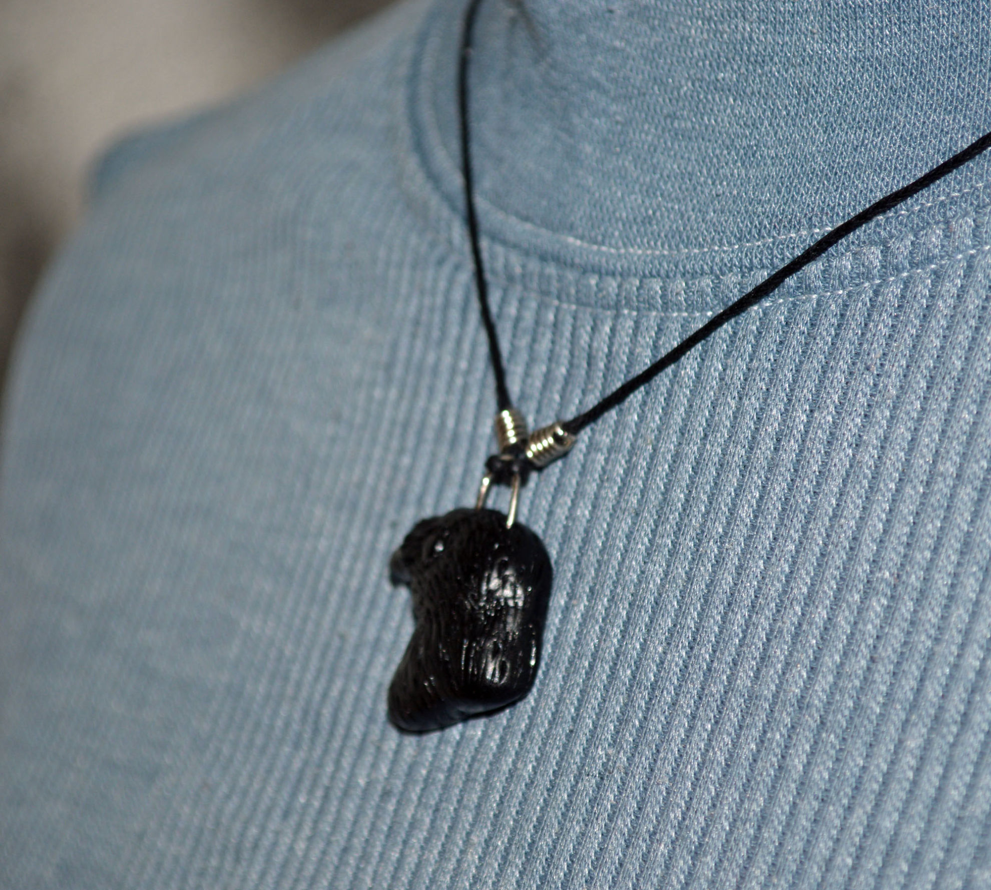 Material: Fimo Schwarz, Baumwollband, Büroklammerdraht,                         Lederbandverschluss
