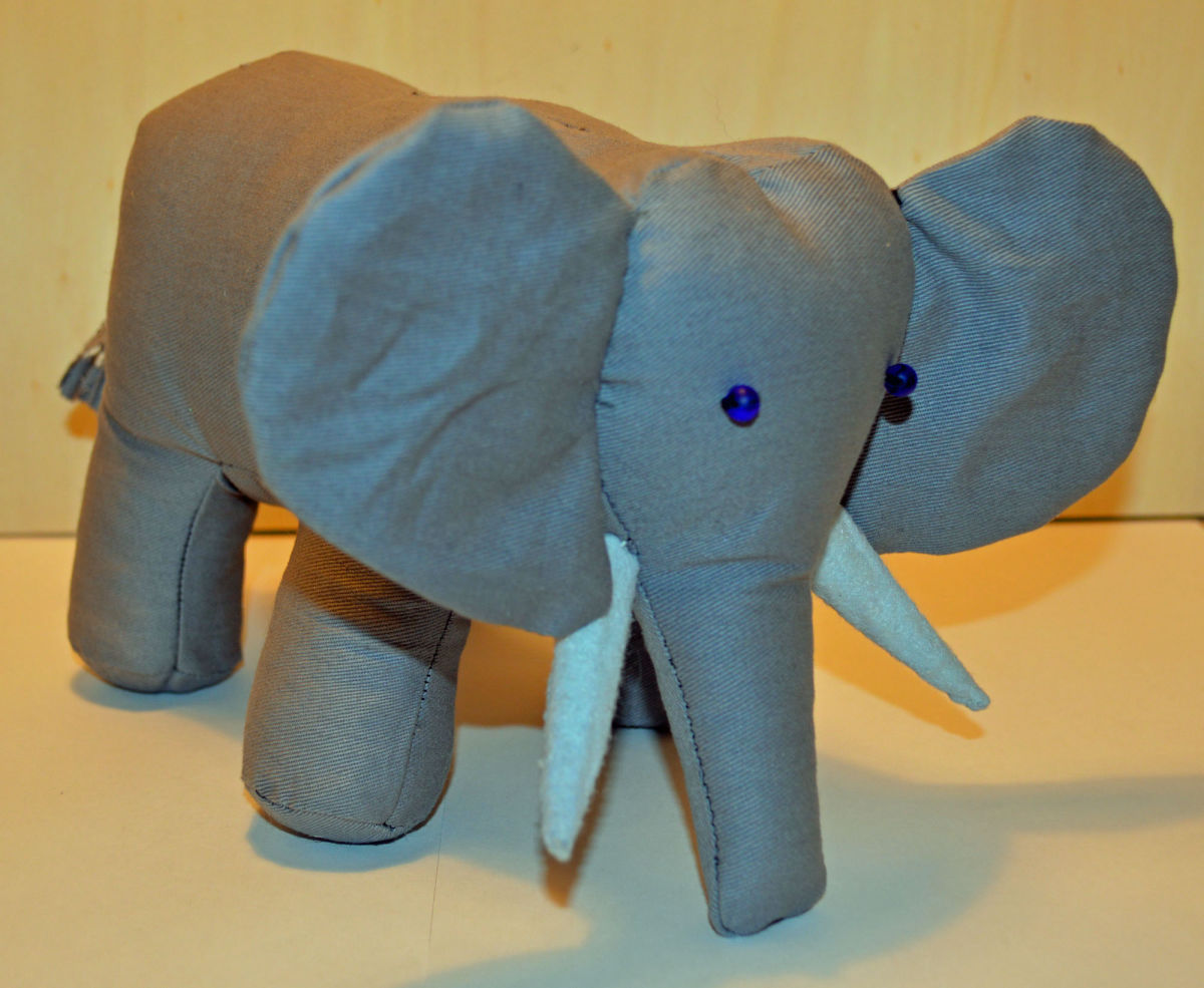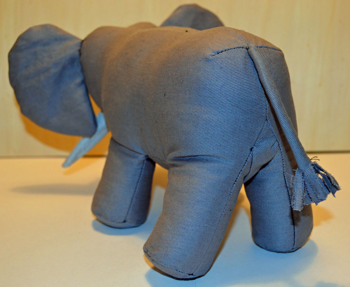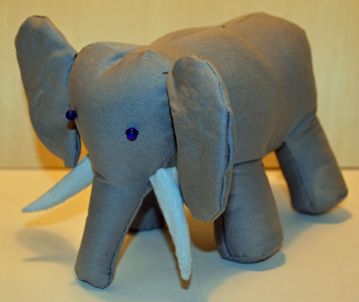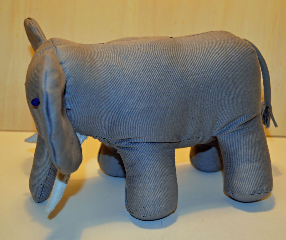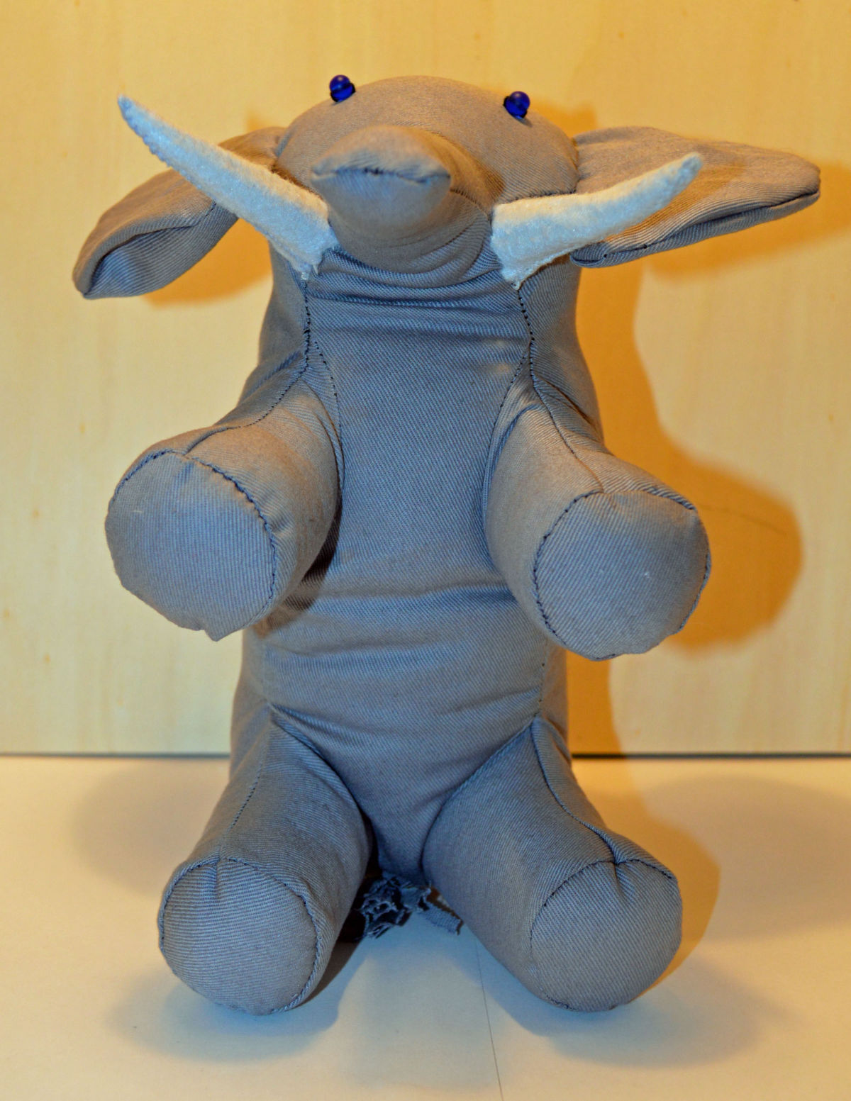 Material: Stoff Grau, Filz Weiss, Blauen Glas Perlenaugen, Bastelwatte