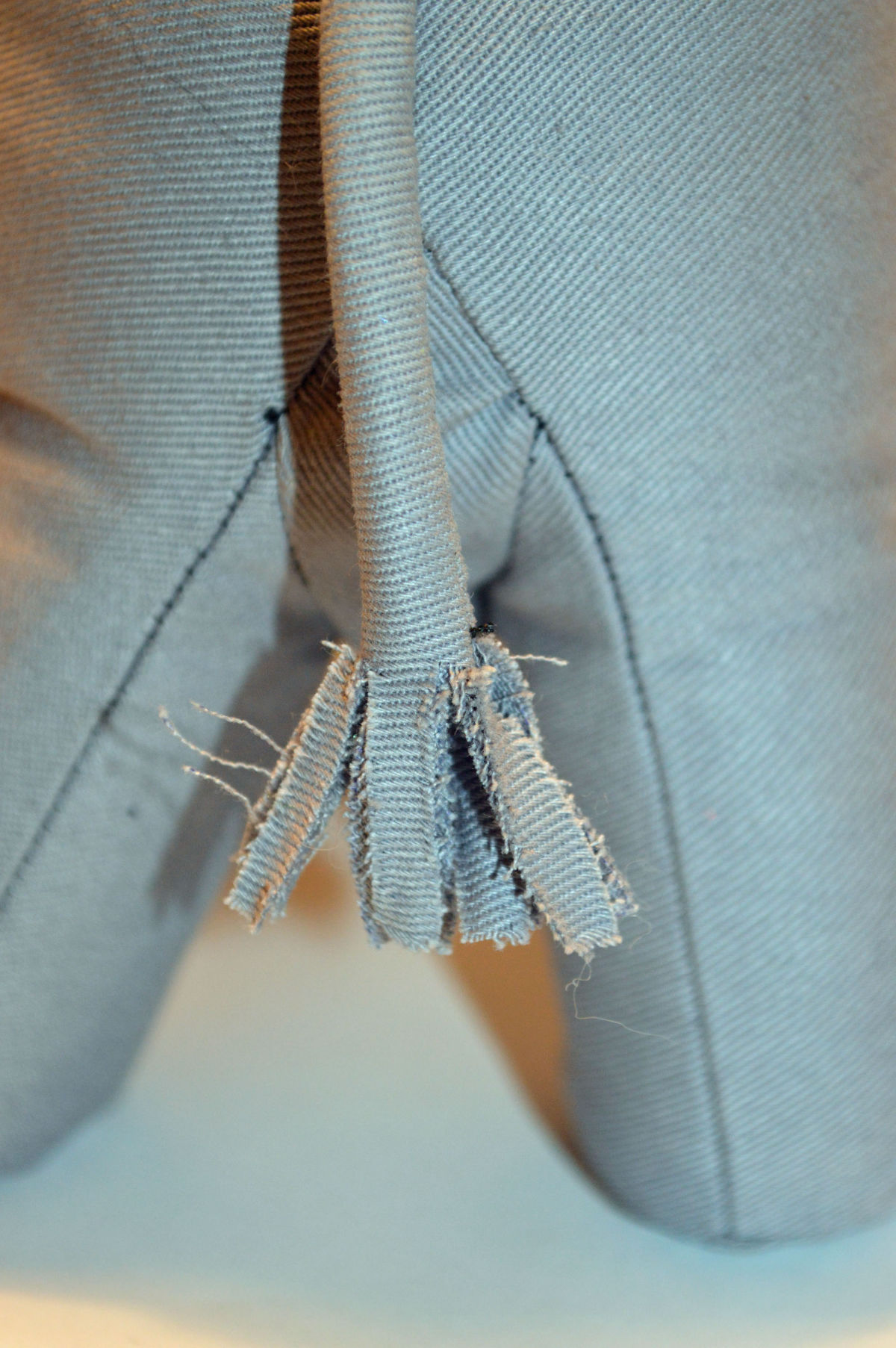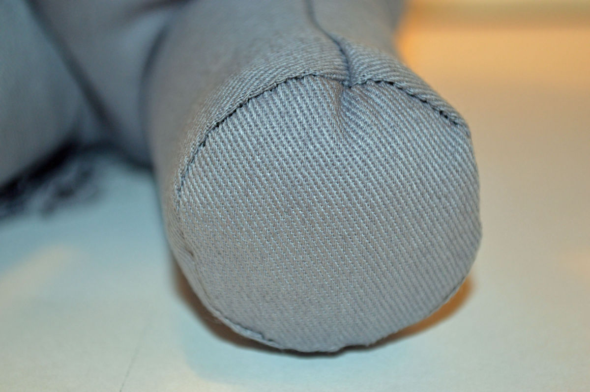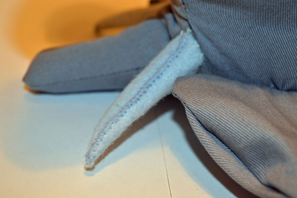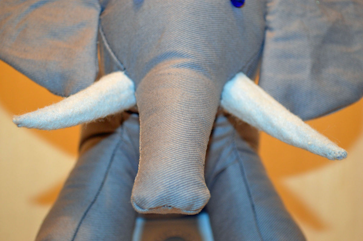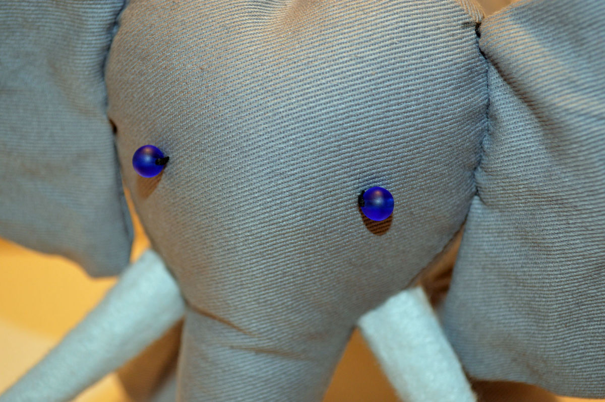 Material: Stoff Grau, Filz Weiss, Blauen Glas Perlenaugen, Bastelwatte