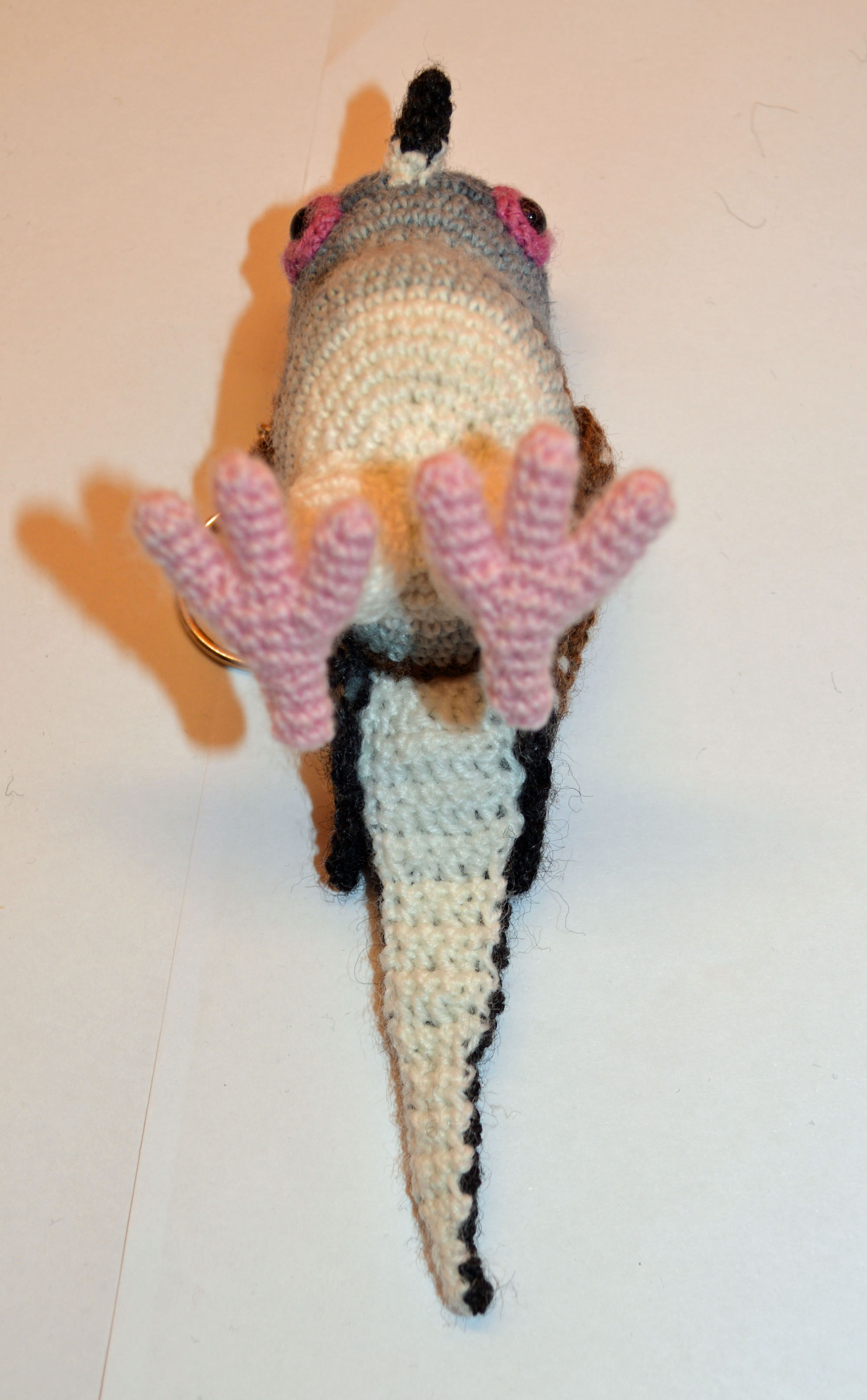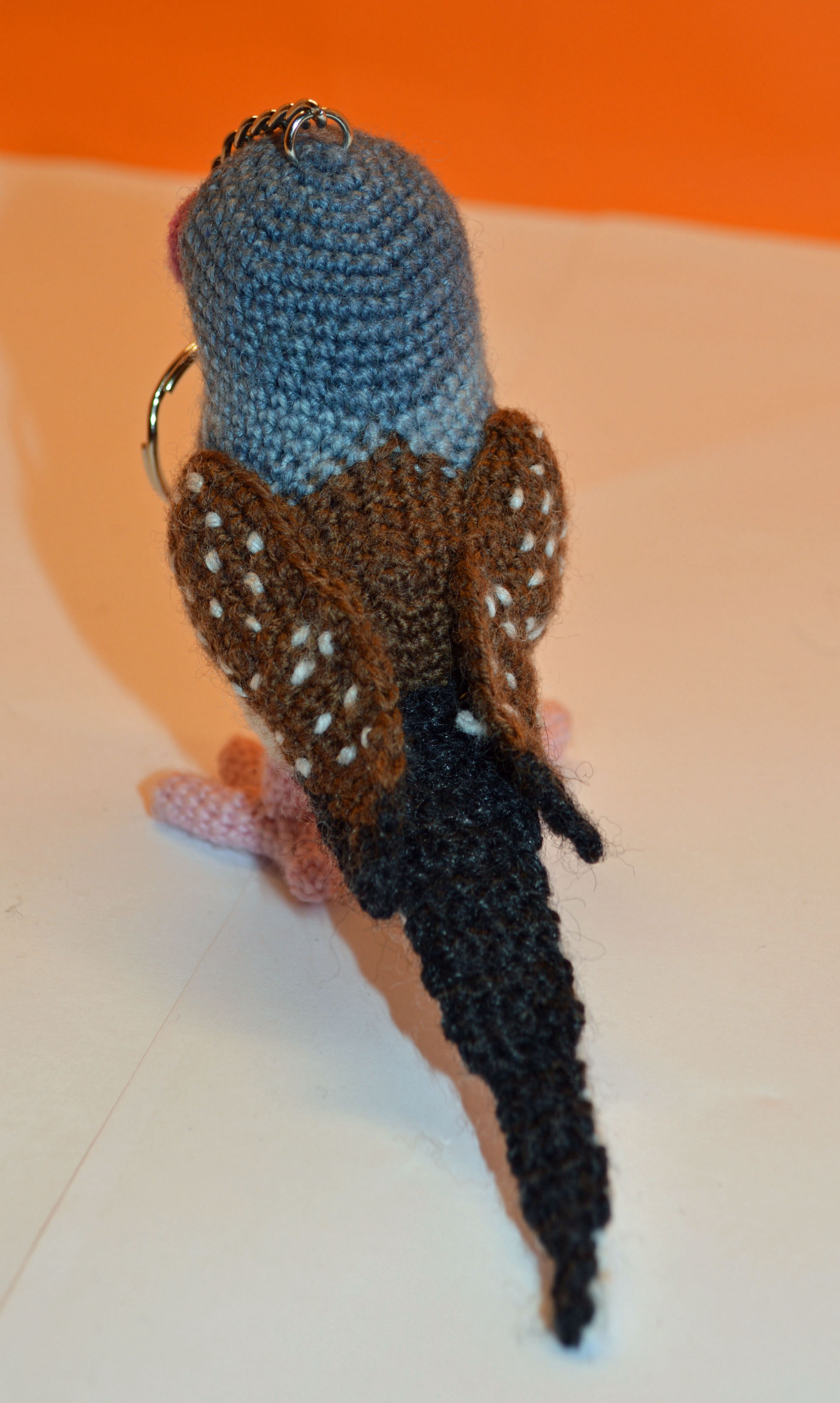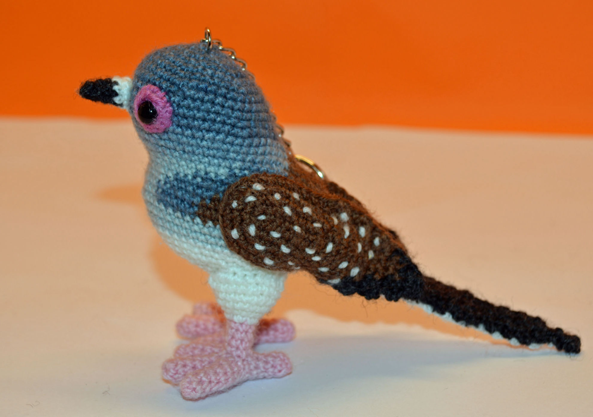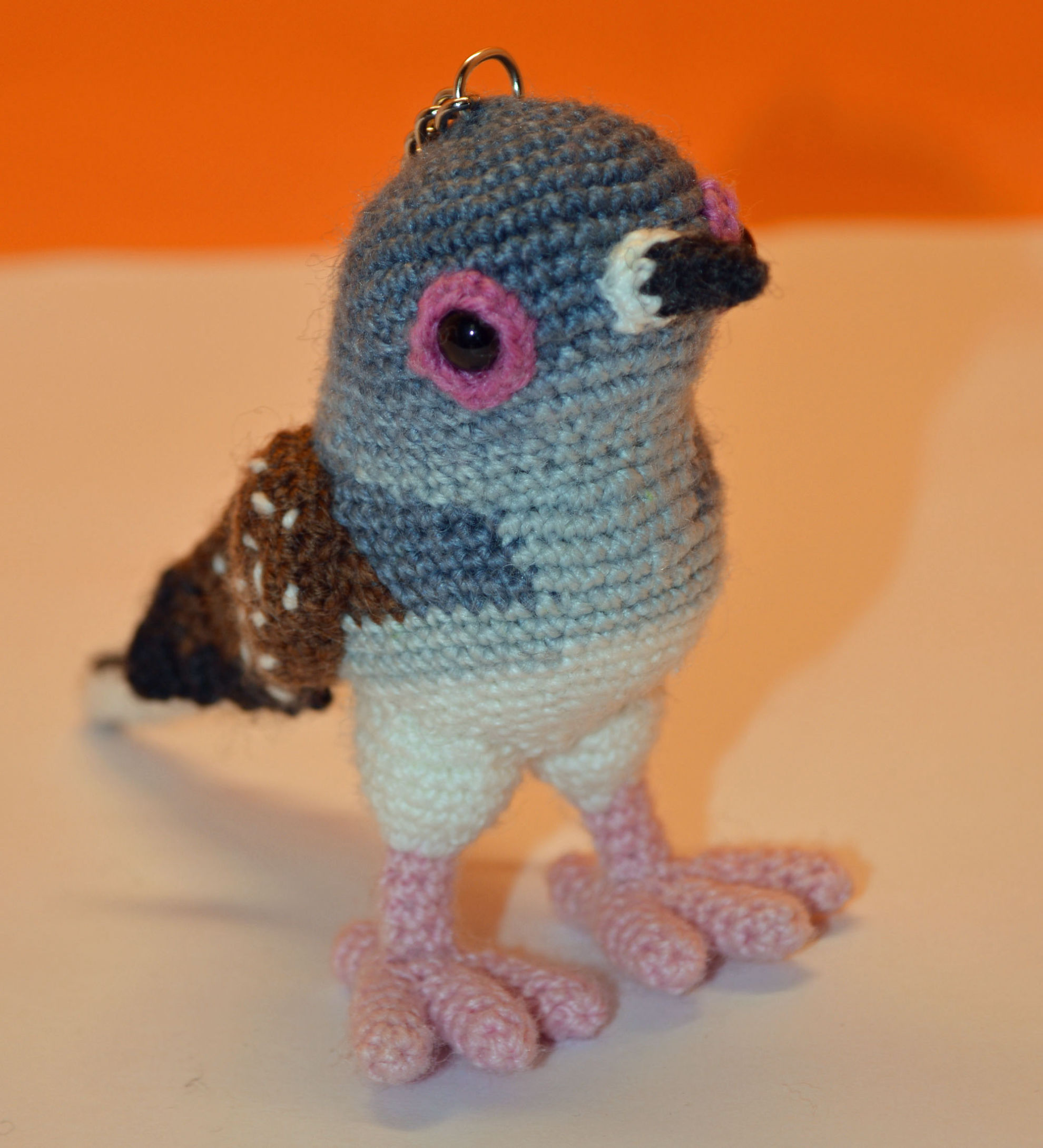 Material: Wolle, verschiedenes Blau, Marrone, Weis, Pink, Anthrazit, Glasaugen, Bastelwatte