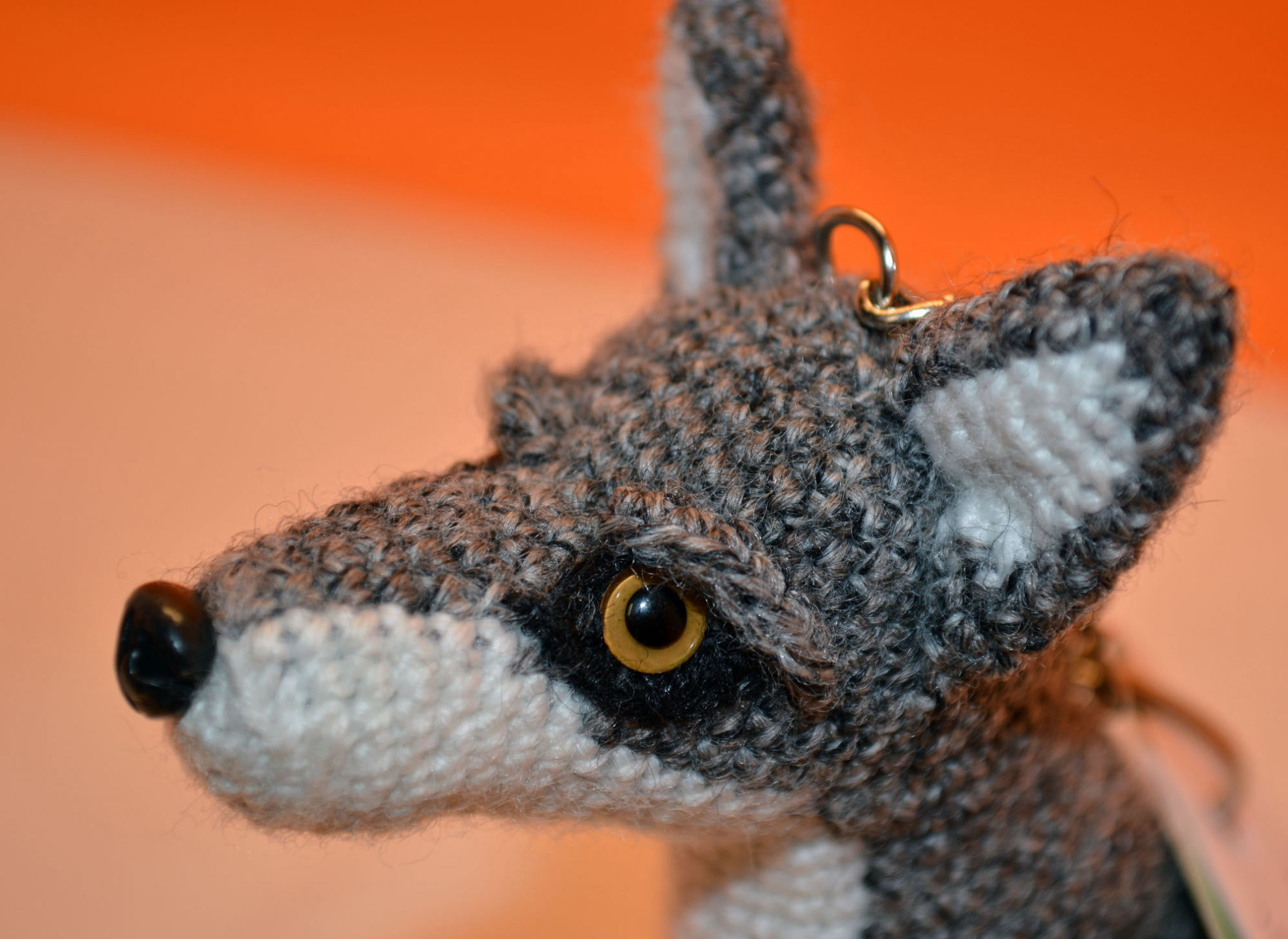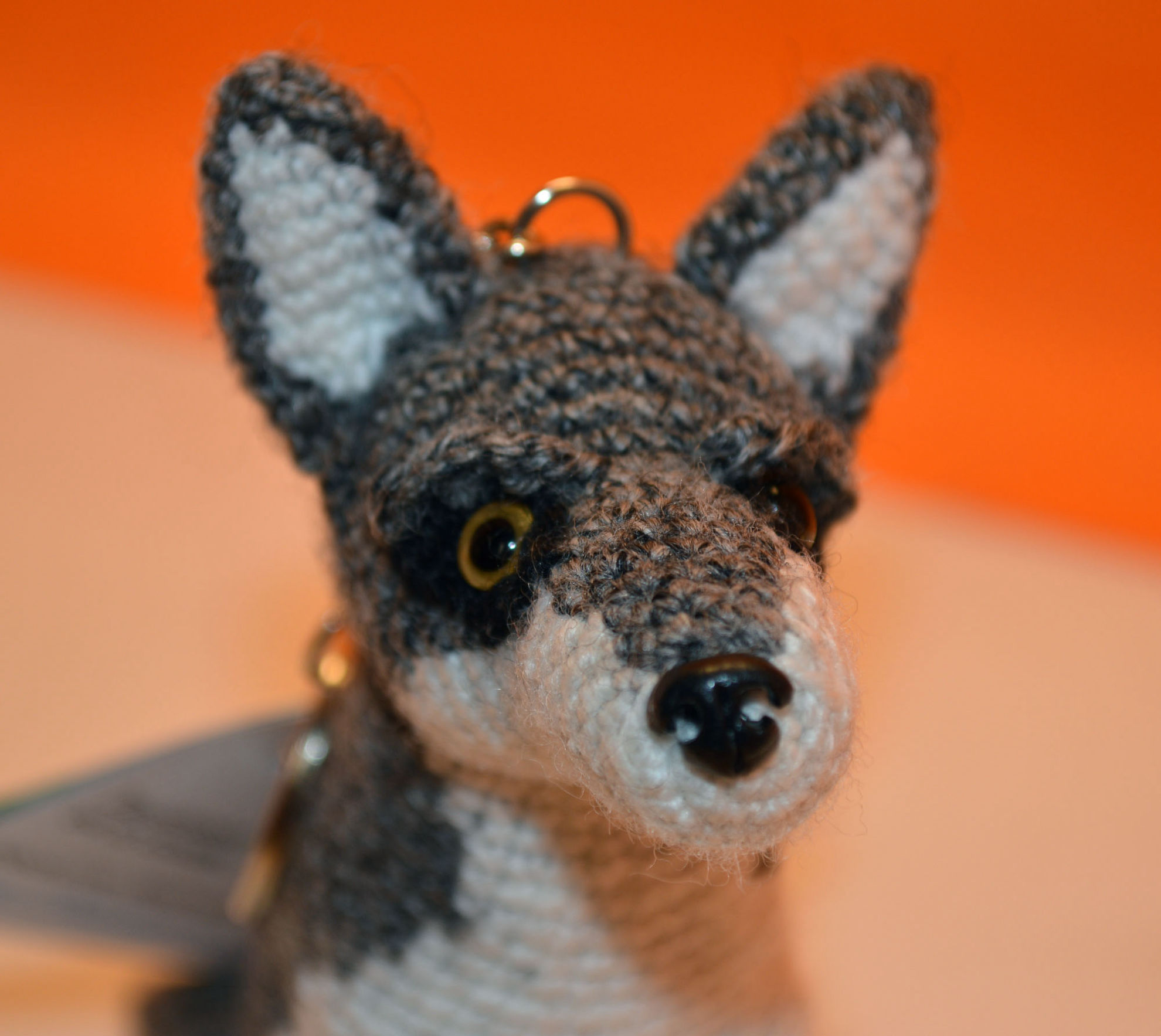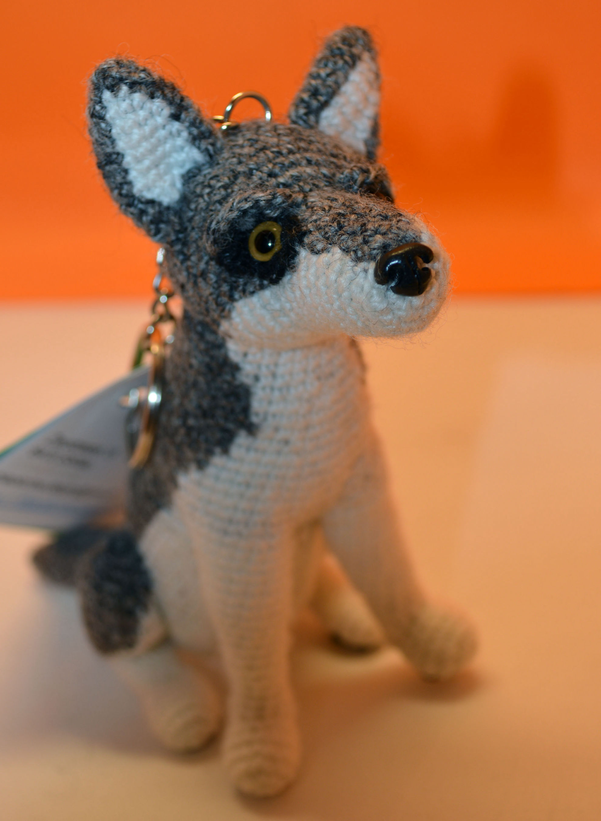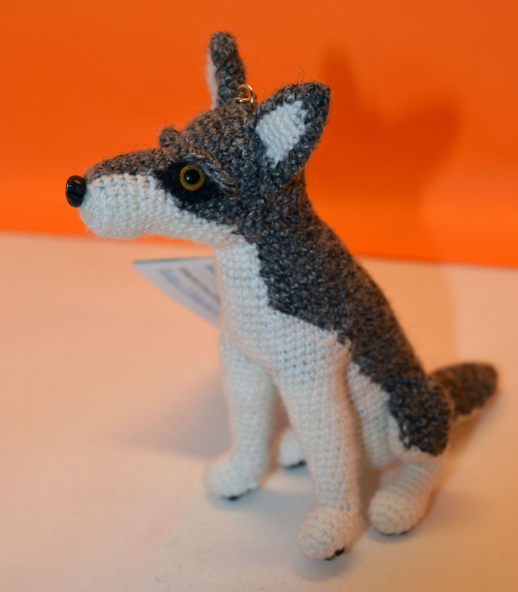 Material: Wolle, Weiss, Grau/Braun Mouliné, Glasaugen,                                 Hundenase Fimo (selbst gemacht), Bauernmalfarbe,                       Bastelwatte