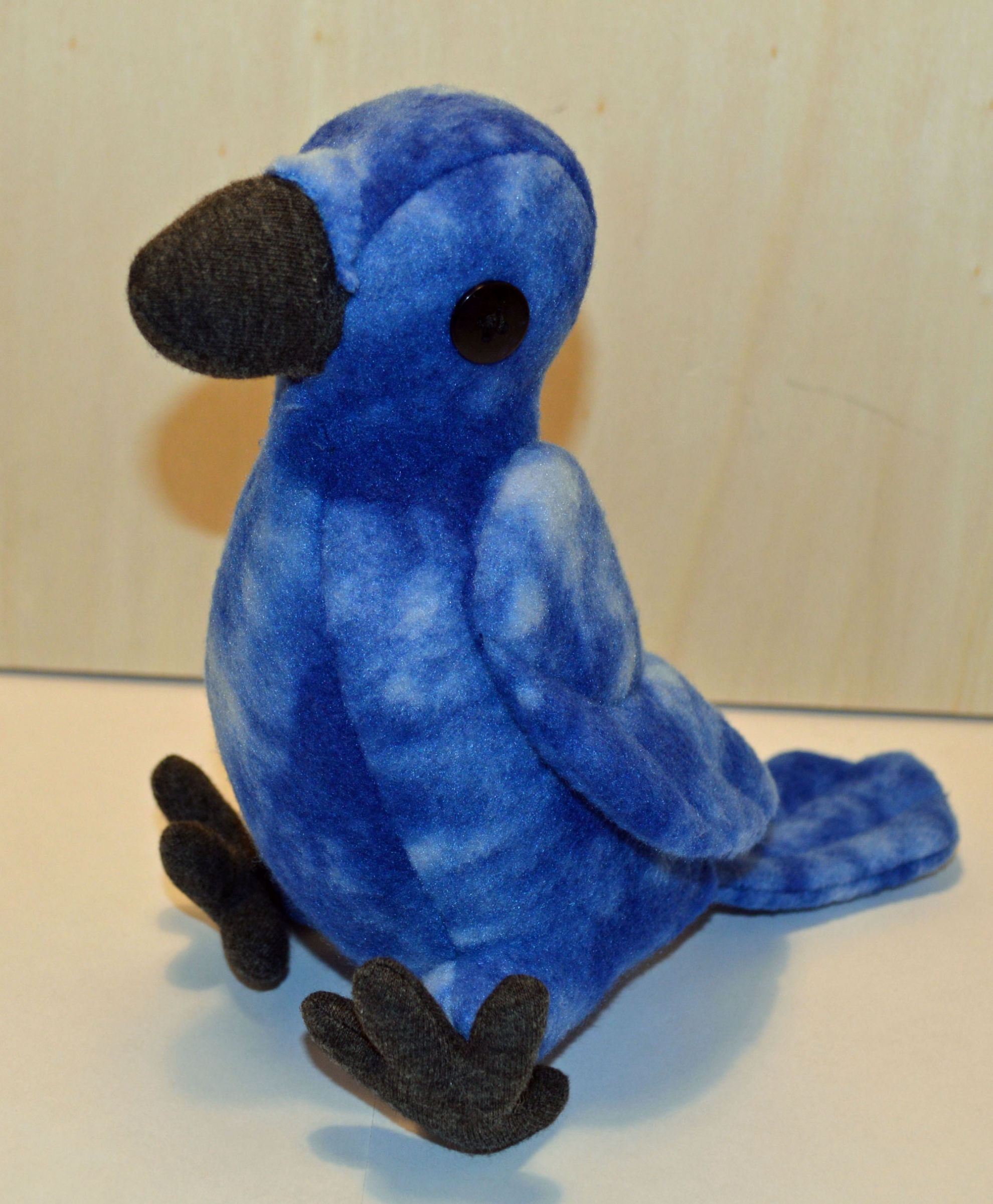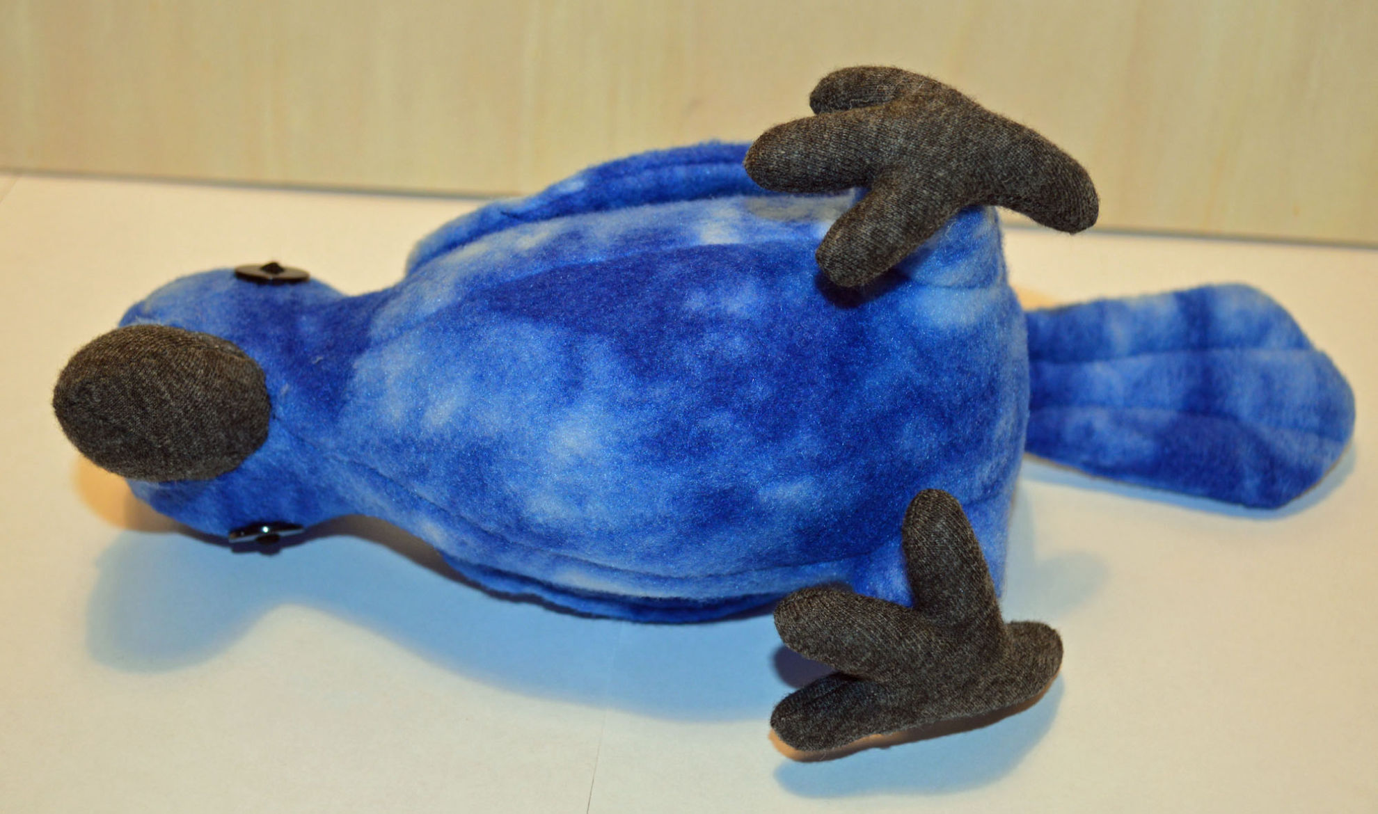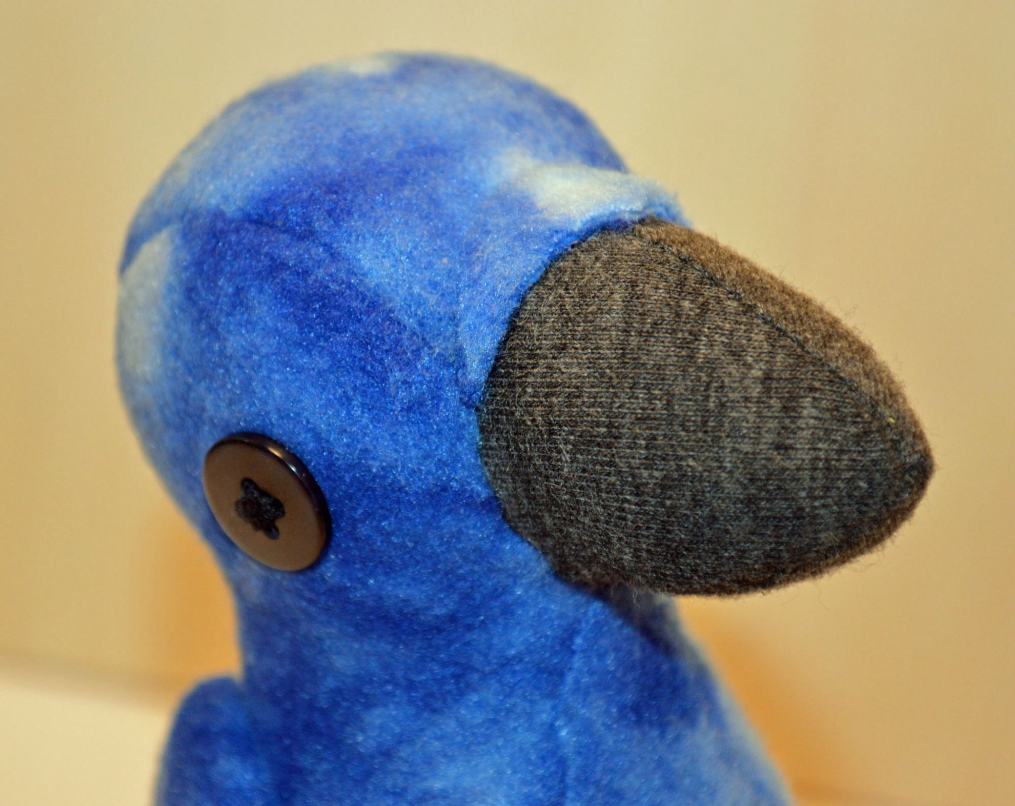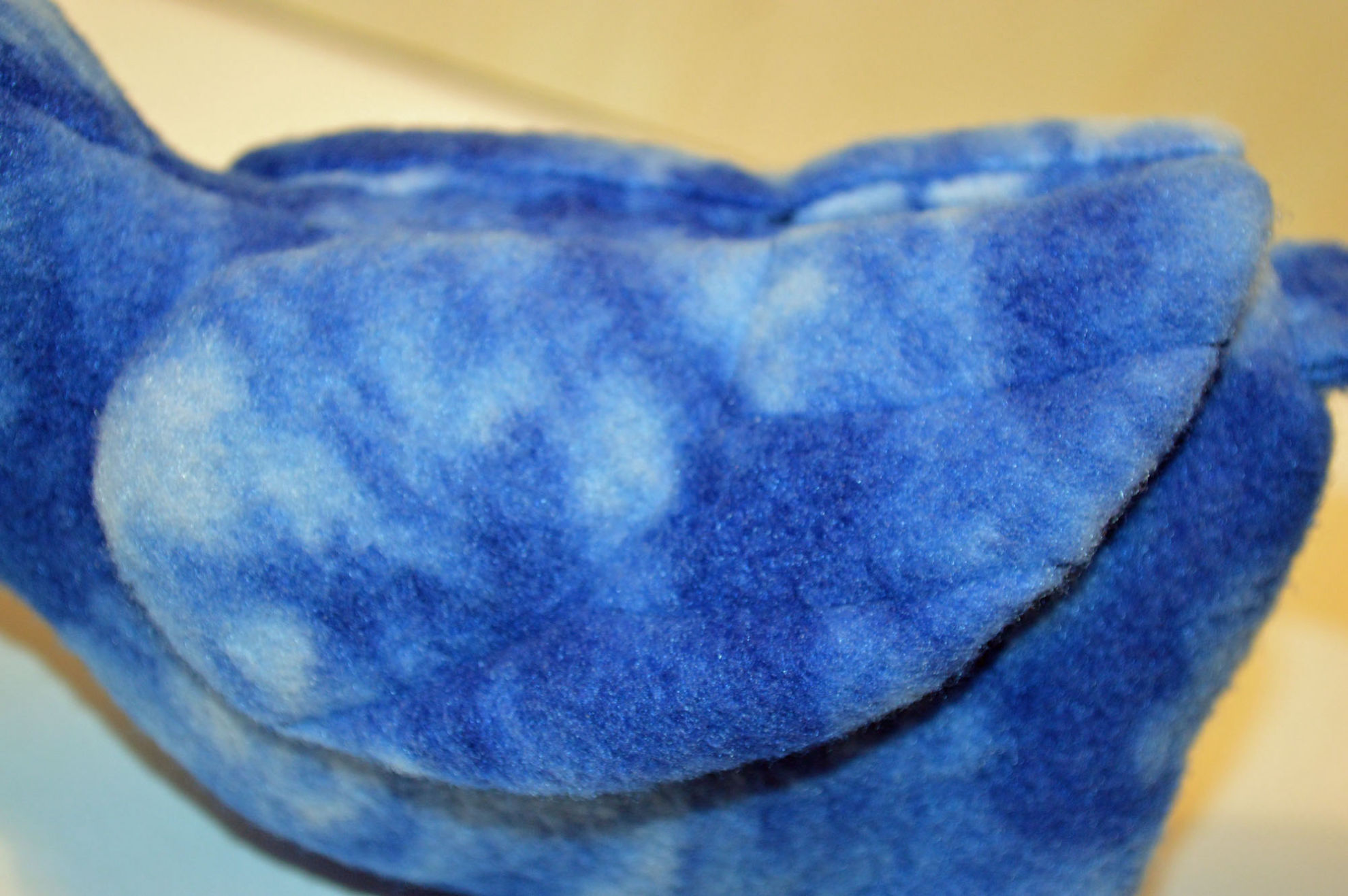 Material: Fleecestoff Blau-Weiss, Jerseystoff Grau, Knopfaugen, Bastelwatte