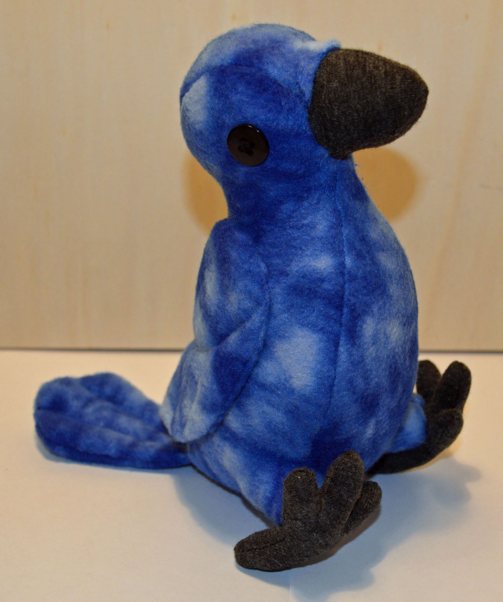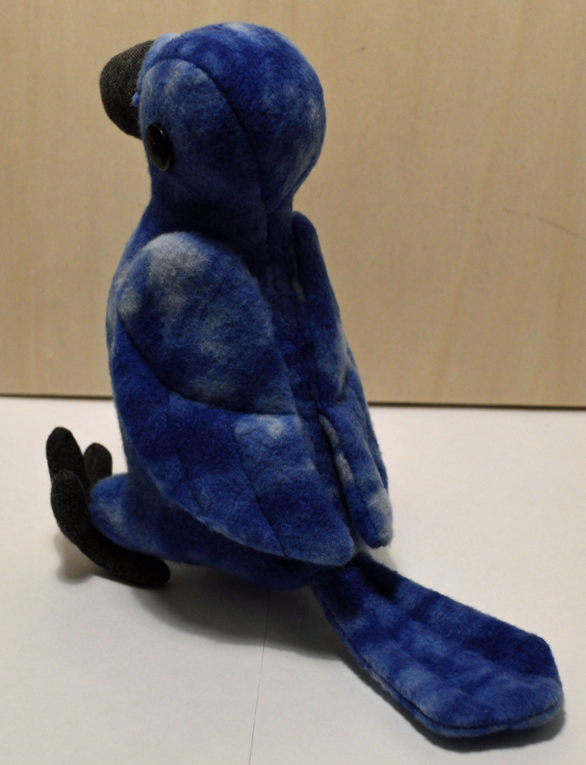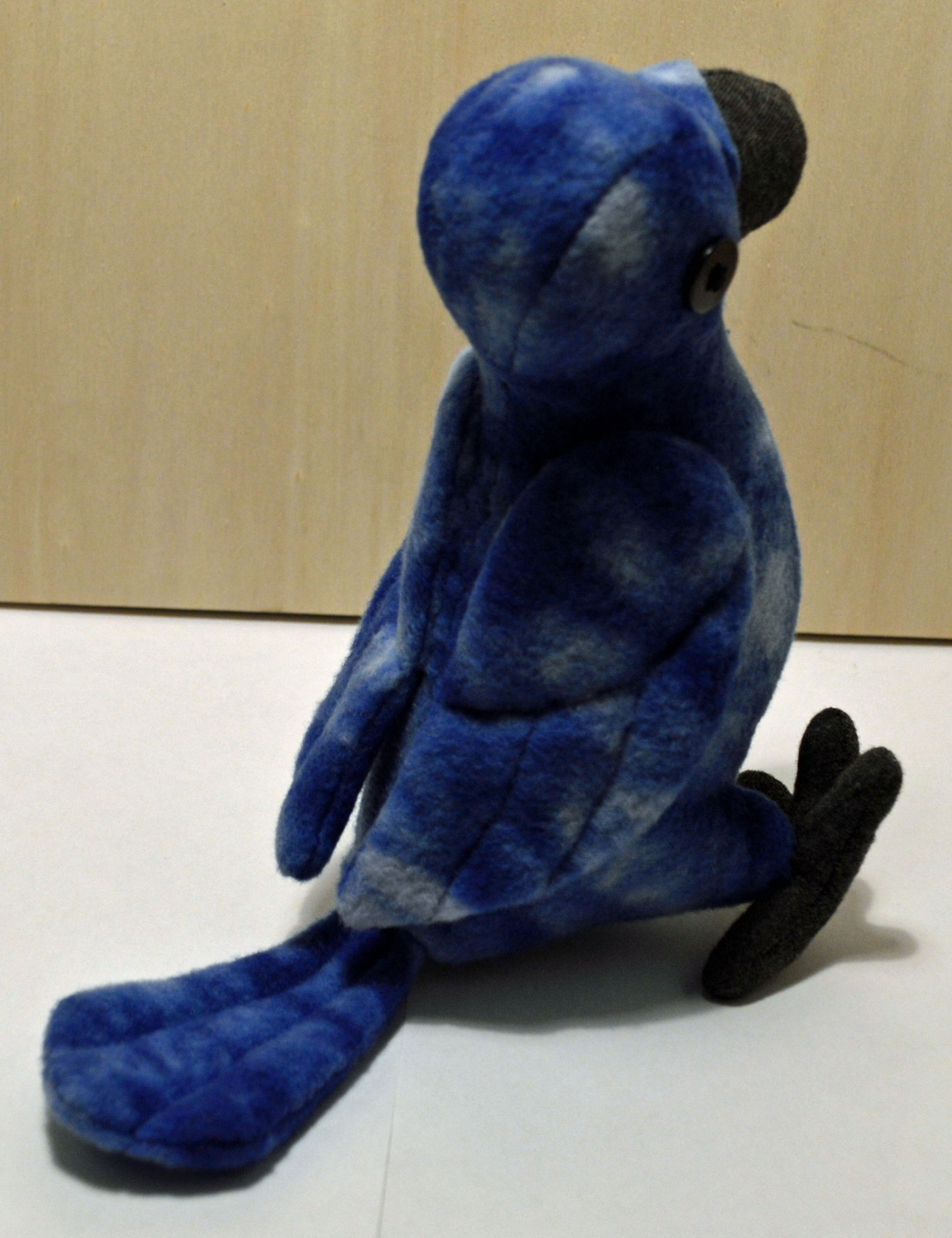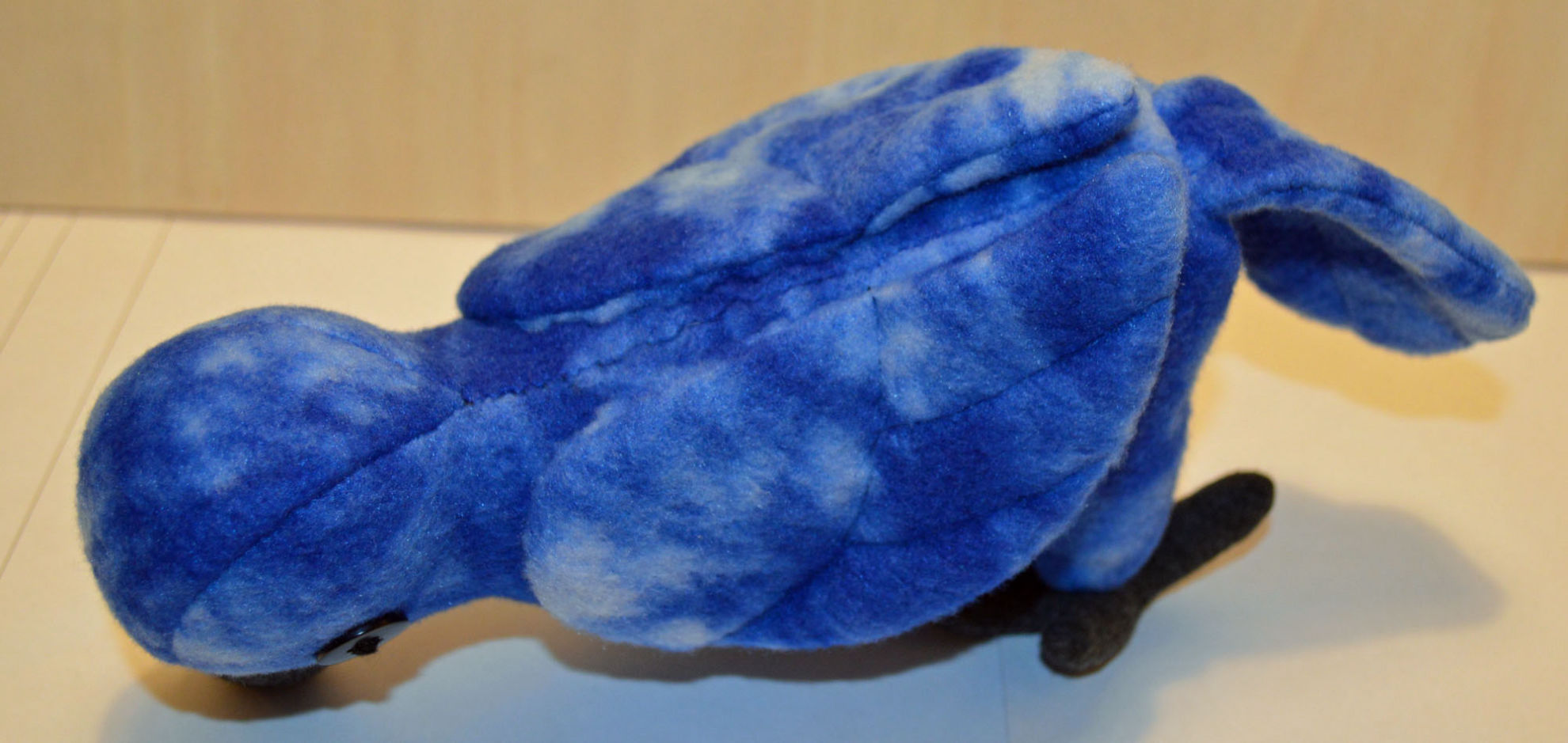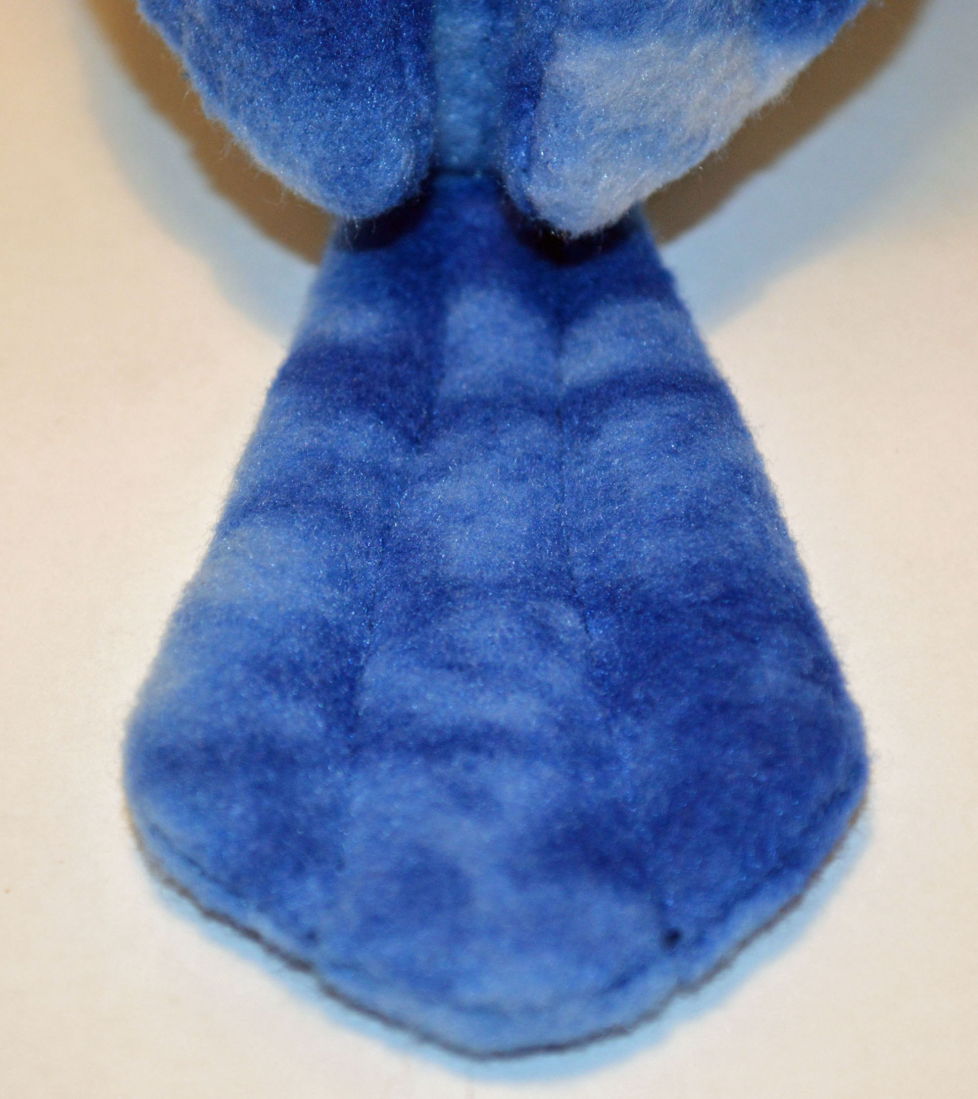 Material: Fleecestoff Blau-Weiss, Jerseystoff Grau, Knopfaugen, Bastelwatte