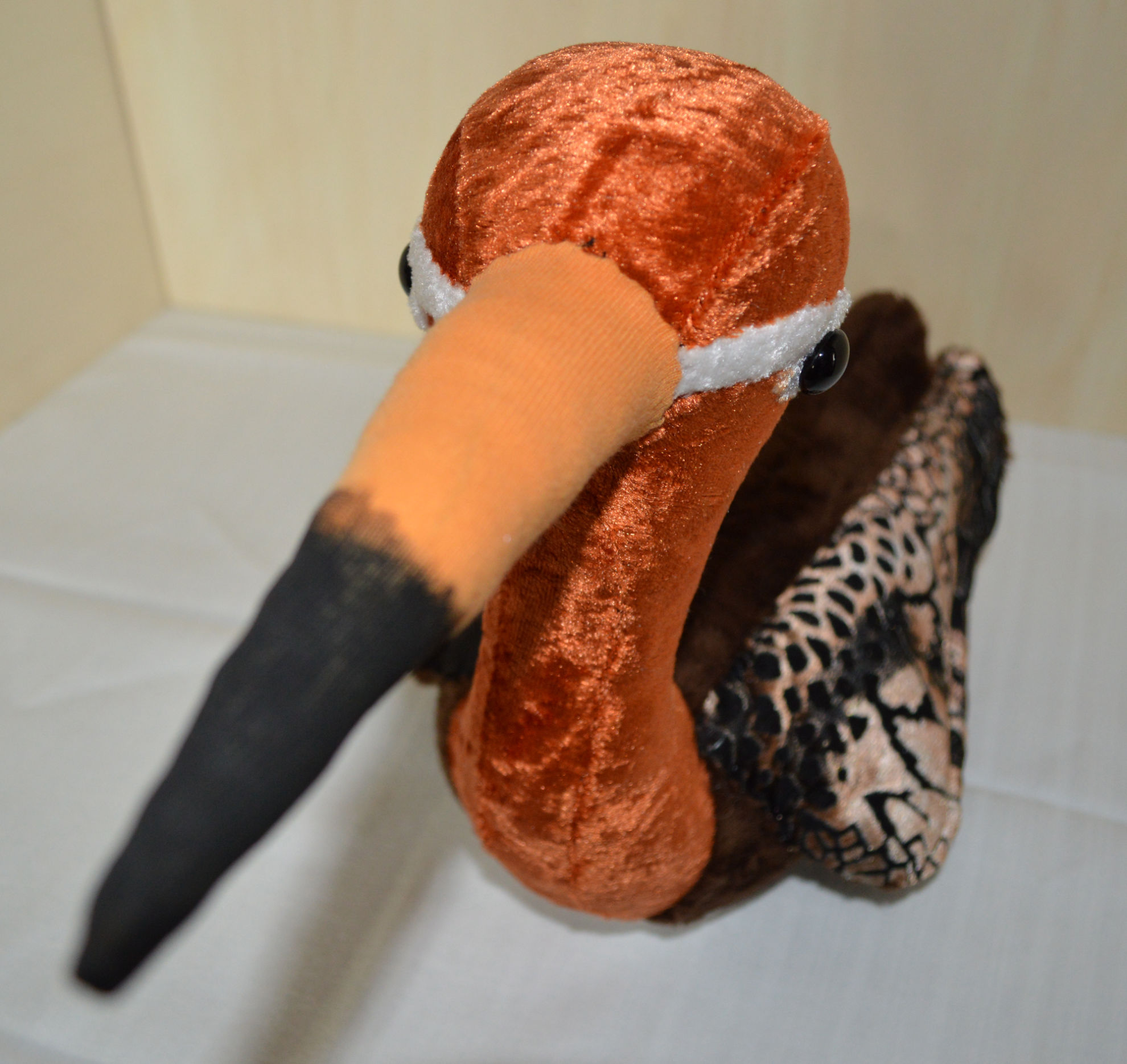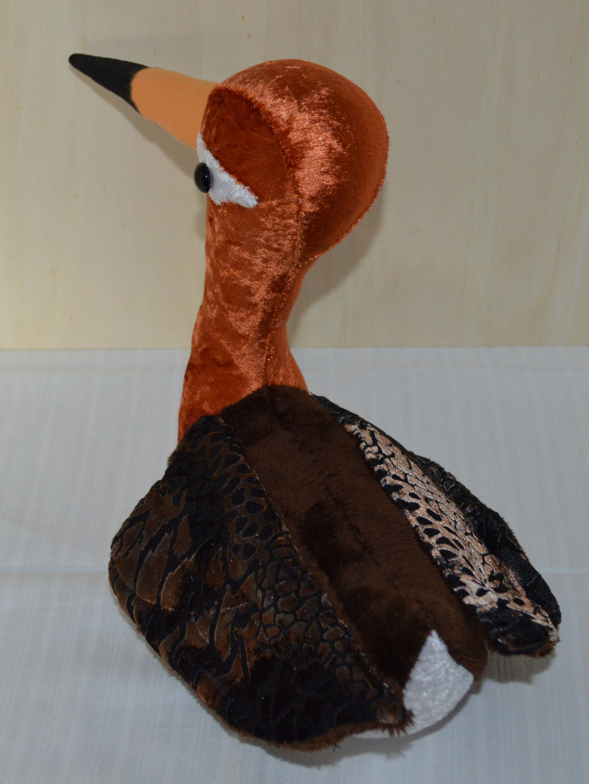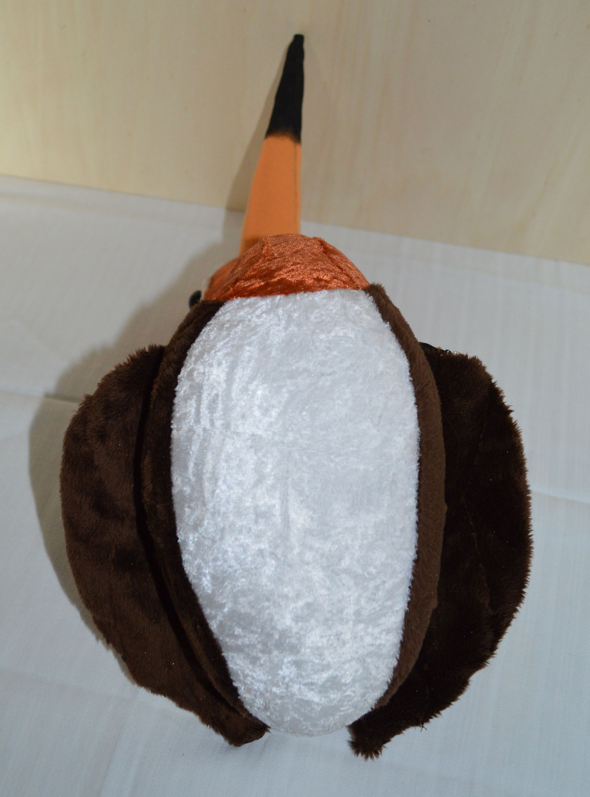 Material: Stoff Braun, Orange, Weiss, Glasaugen, Bastelwatte