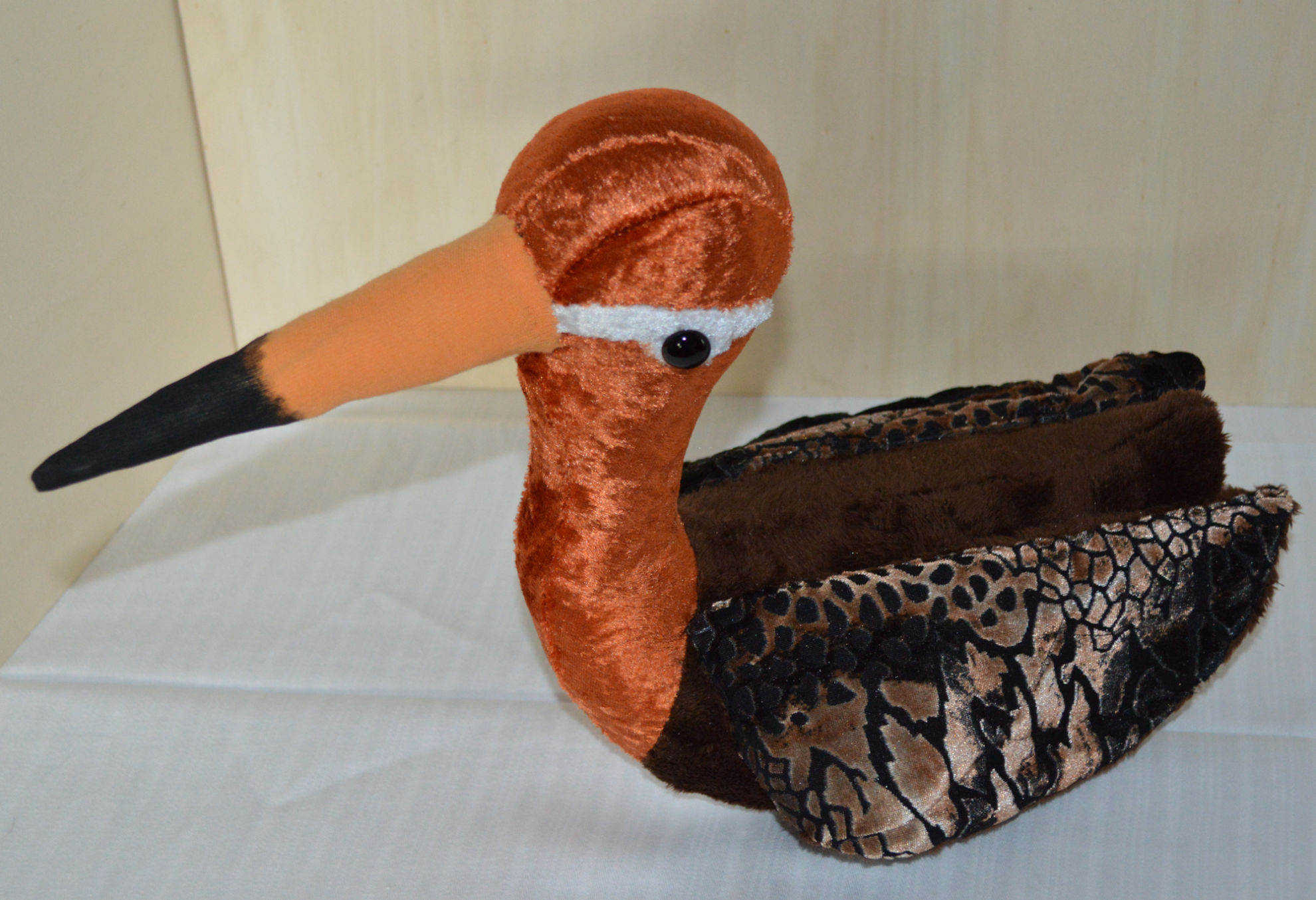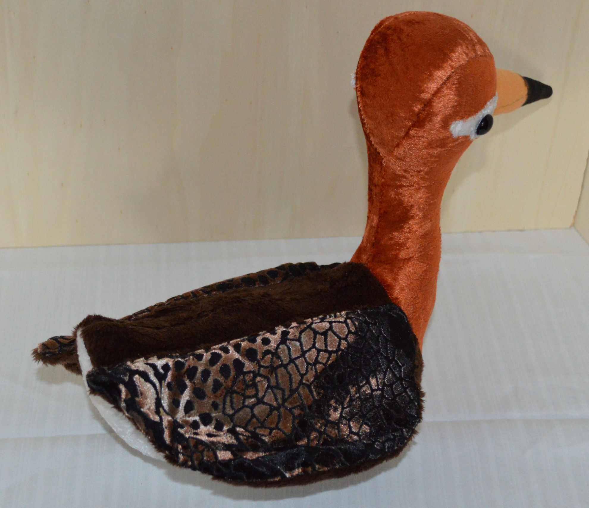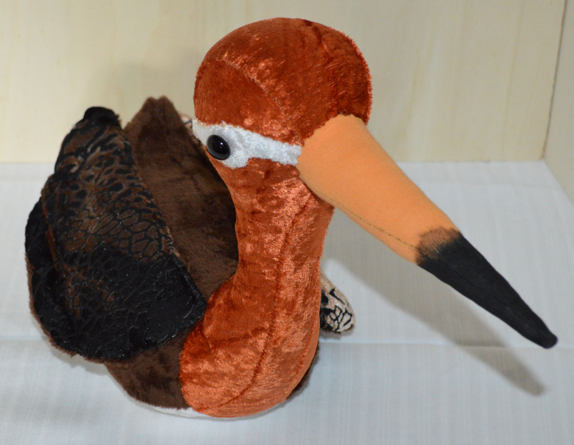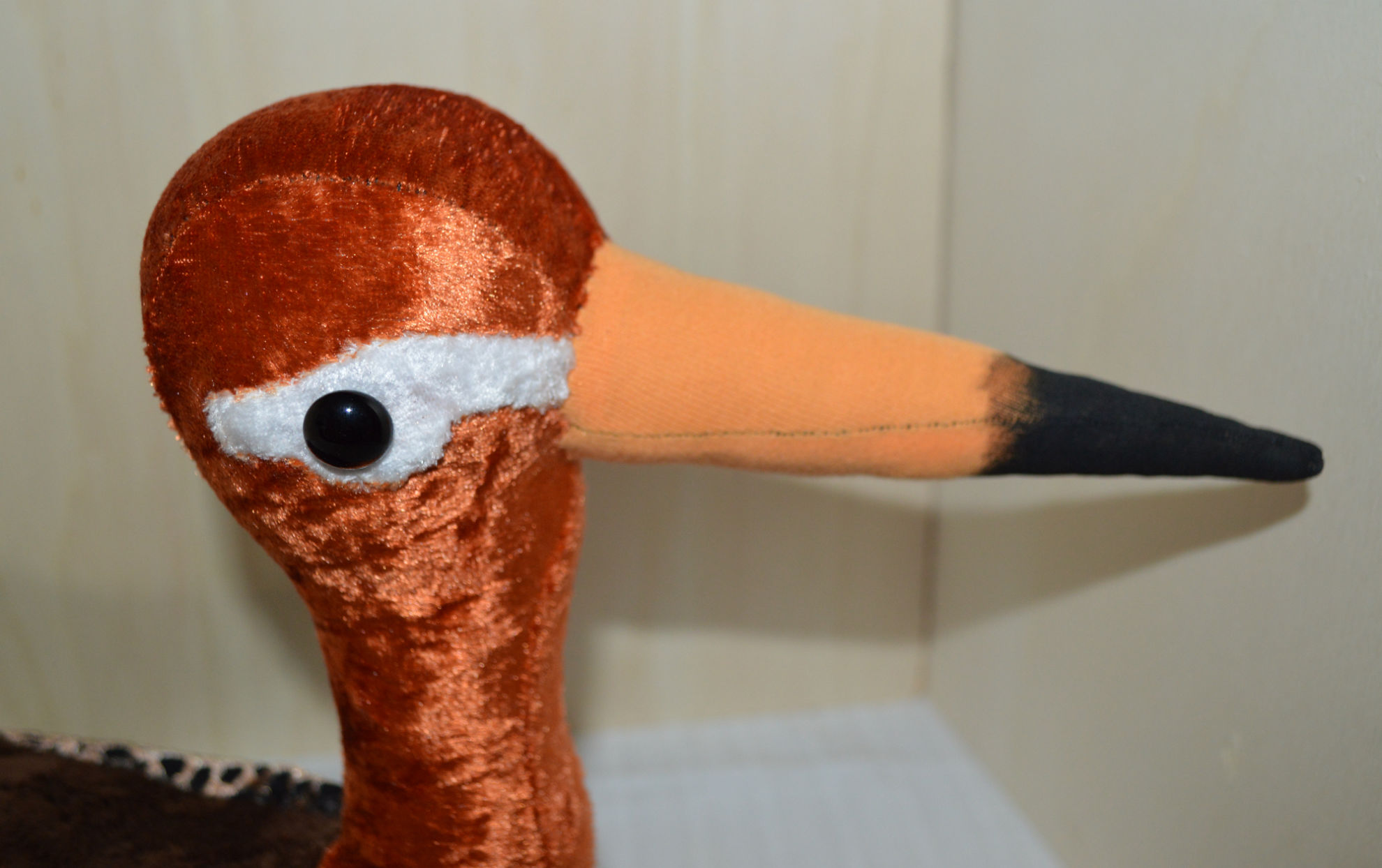 Material: Stoff Braun, Orange, Weiss, Glasaugen, Bastelwatte