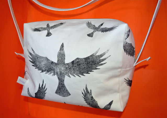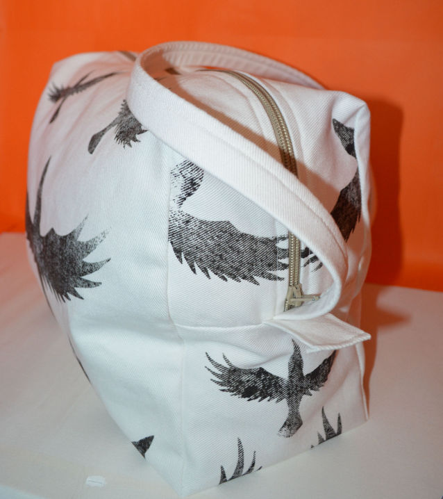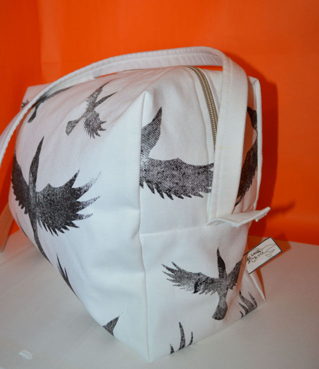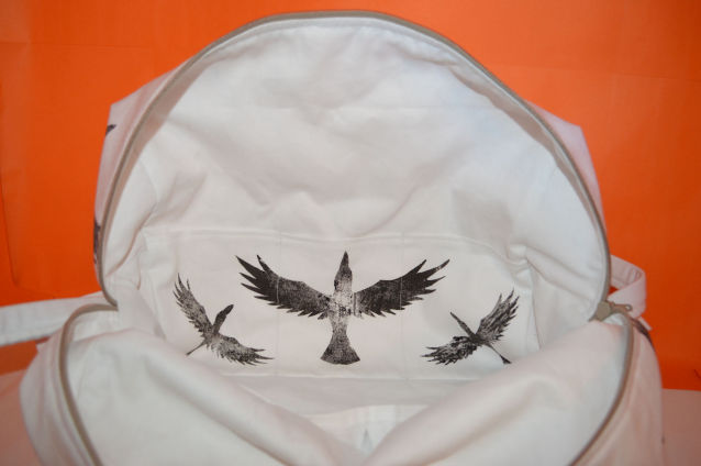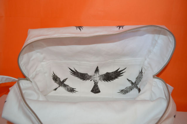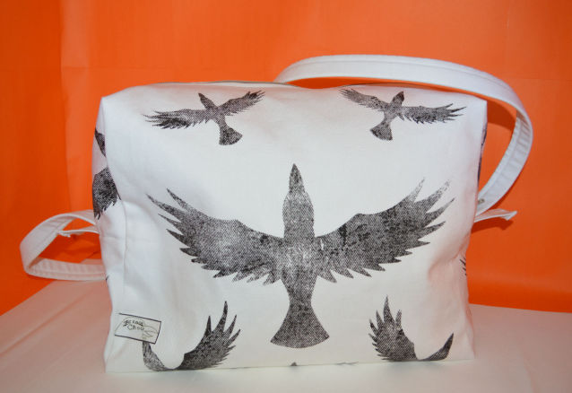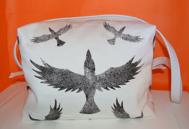 Material: Stoff Weiss, Motiv selber gestaltet "Fliegende Krähe", Bauernmalfarbe, Reissverschluss, Rollladengurt, Plexiglas (Bodenverstärkung)
