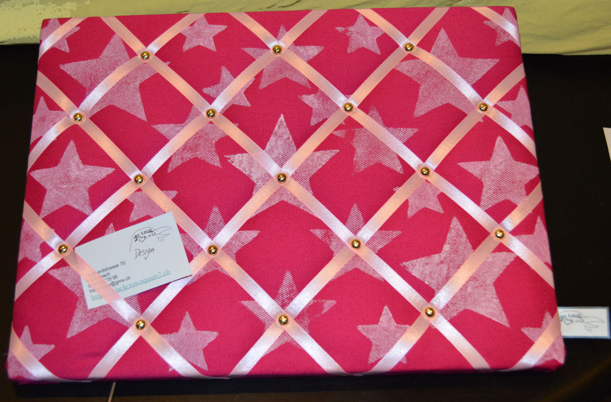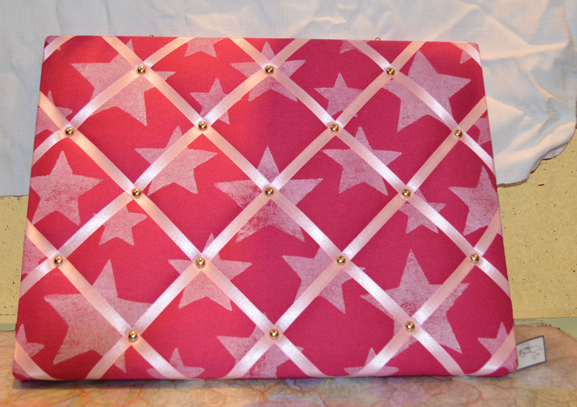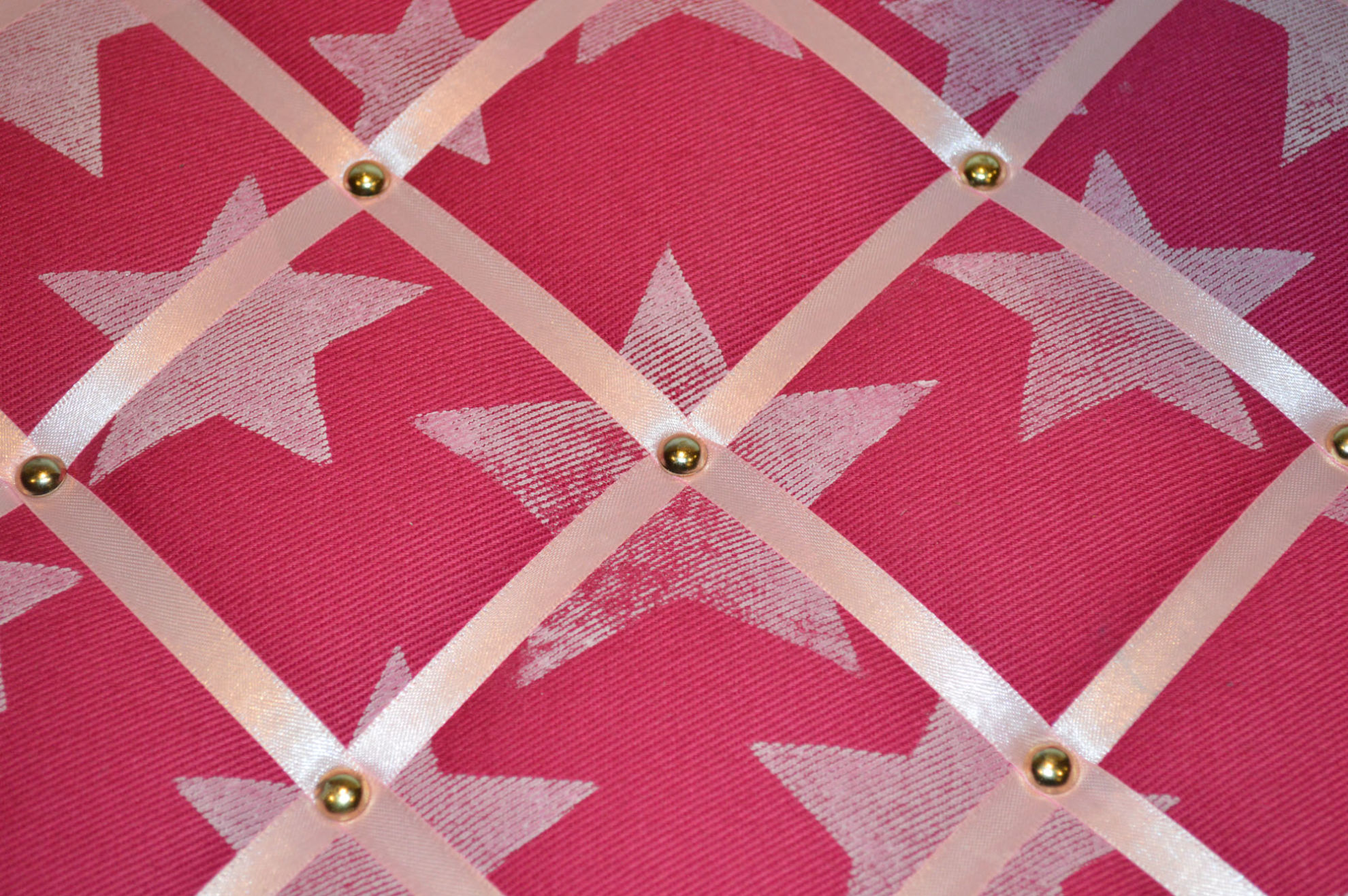 Material: Stoff, Holz, Druck Motiv selber gestaltet "Sterne", Bauernmalfarbe, Polsternagel, Bilderösen, Band, Bastelwatte