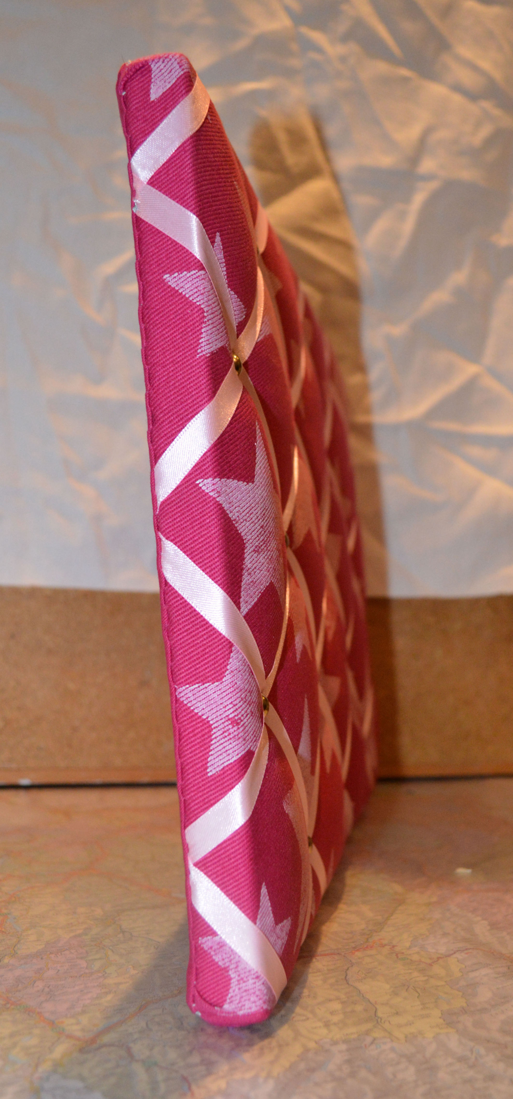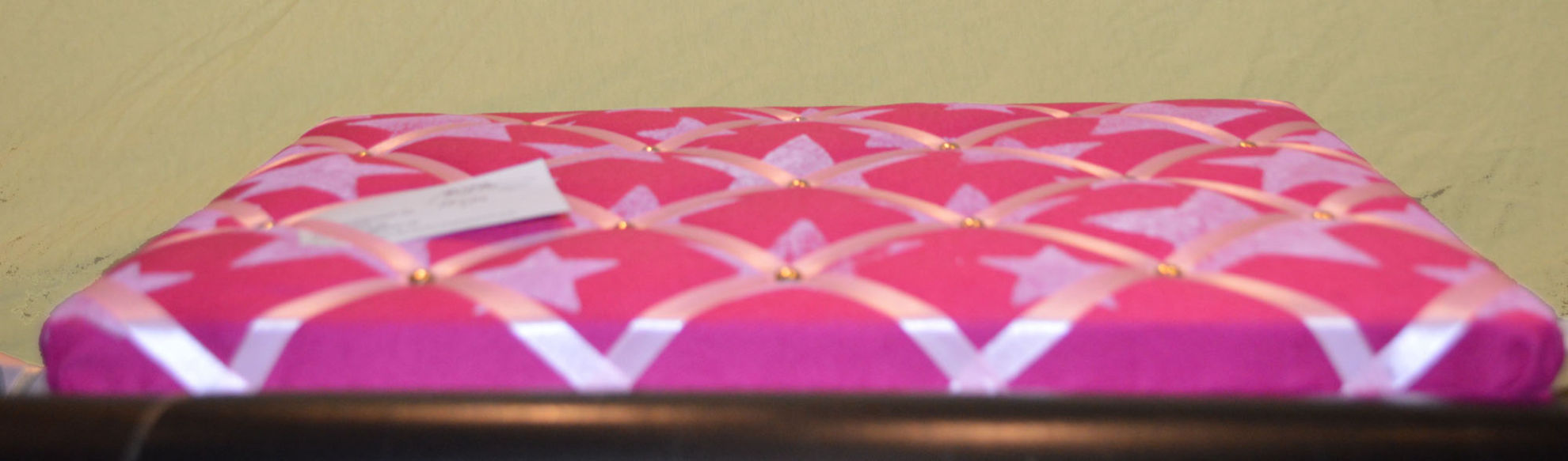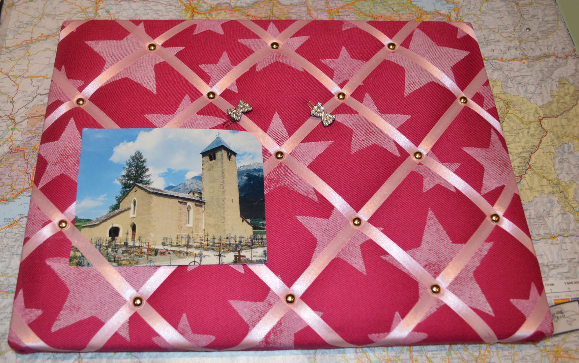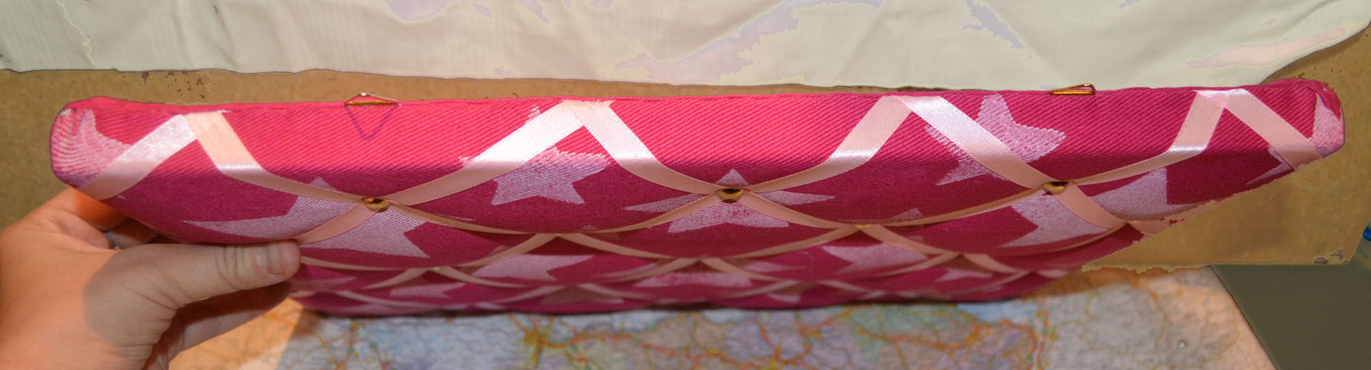 Material: Stoff, Holz, Druck Motiv selber gestaltet "Sterne", Bauernmalfarbe, Polsternagel, Bilderösen, Band, Bastelwatte